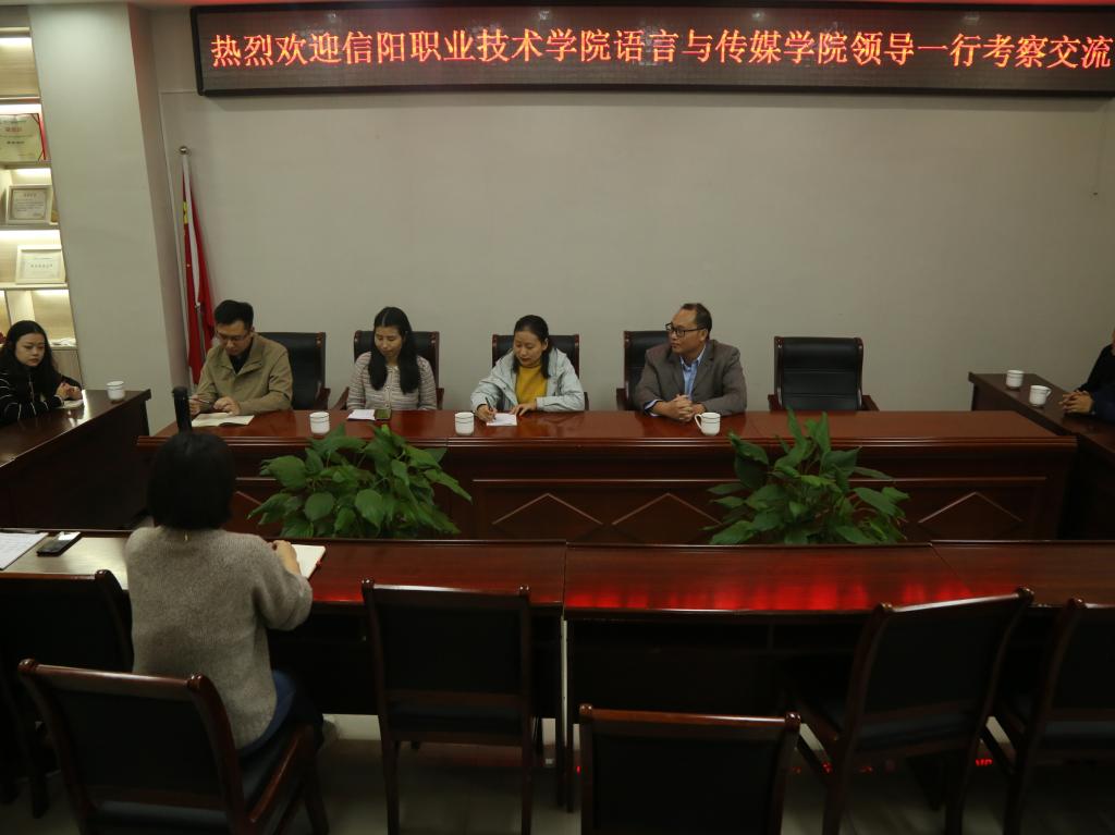 10月14日,信阳职业技术学院语言与英国上市公司365副院长梁维东、蒋吉优一行来我院考察交流。吕东亮院长、田华副院长出席座谈会。