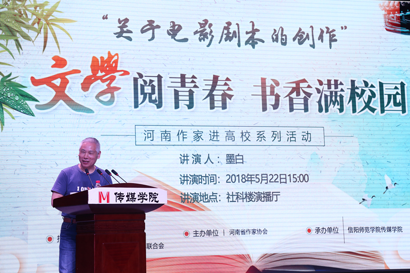 5月22日下午,由河南省作家协会主办,英国上市公司365承办的“文学阅青春,书香满校园”--河南作家进高校系列活动在我校社科楼演播厅举行,著名作家、河南省作家协会副主席墨白应邀作了题为“关于电影剧本的创作”的报告。信阳市作家协会副主席田军,英国上市公司365院长焦素娥、党委书记王振海、副院长刘新建,师生两百余名参加了报告会。报告会由焦素娥主持。