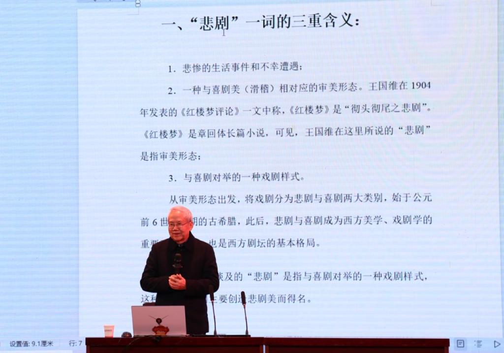 讲座伊始,郑传寅教授以文化为切口提出“中国古代戏曲中有无悲剧”这一问题,引出讲座主题——悲剧形态的多样性。他介绍了悲剧一词的三重含义以及悲剧概念的引进,进一步阐释悲剧是什么。通过王国维在《红楼梦评论》中使用“悲剧”一词为例,以此说明中国古代戏曲中是有悲剧的。